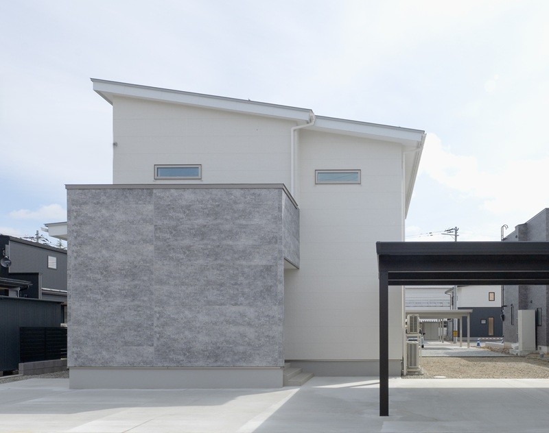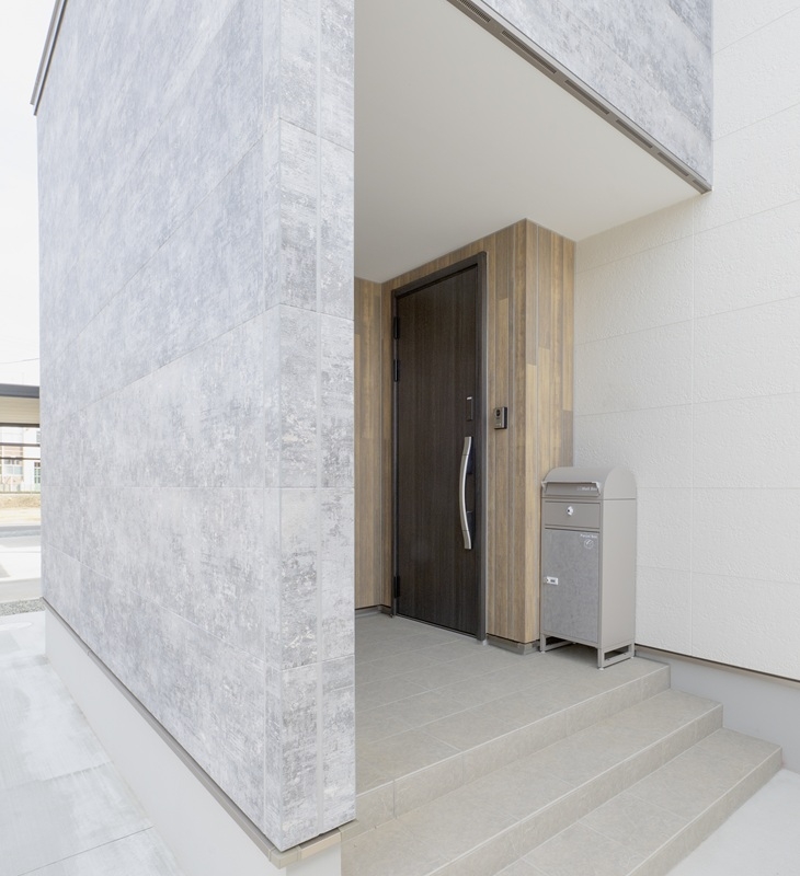 ホワイトの外壁と魅力を引き立てるグレーの外壁、木目調の外壁を玄関のアクセントにした
